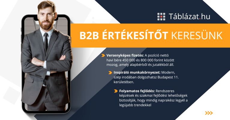 👉 Egy piacvezető cég tagja lehetsz: A Tablazat.Hu már bizonyított a B2B piacán, és folyamatosan azon dolgozunk, hogy újabb sikereket érjünk el. Egy ilyen céghez csatlakozva lehetőséged lesz a saját sikereiddel hozzájárulni a vállalat növekedéséhez.